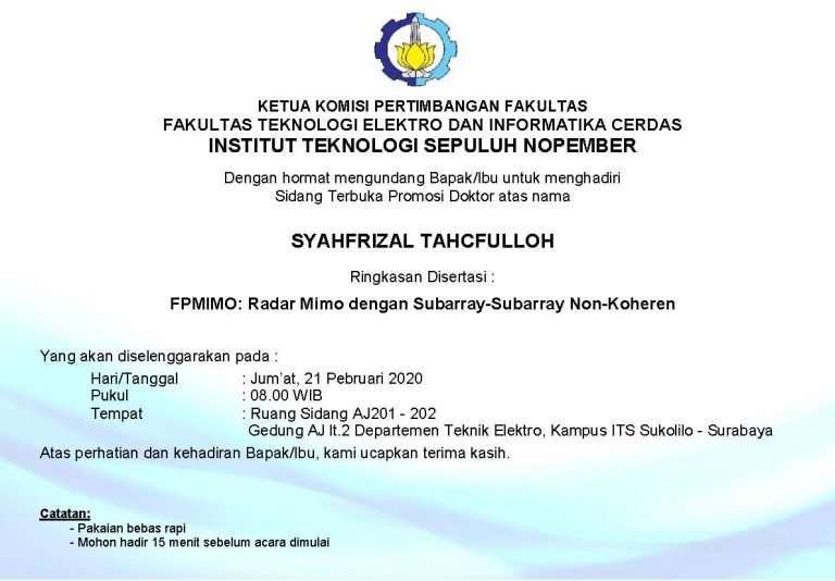 SIDANG TERBUKA PROMOSI DOKTOR SYAHFRIZAL TAHCFULLOH 07111560010003 Ringkasan Disertasi : FPMIMO: RADAR MIMO DENGAN