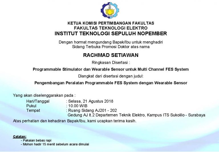 SIDANG TERBUKA PROMOSI DOKTOR RACHMAD SETIAWAN 07111060010004 Ringkasan Disertasi : PROGRAMMABLE STIMULATOR DAN WEARABLE