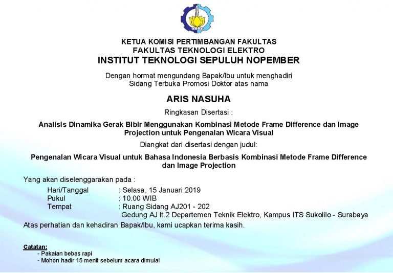 SIDANG TERBUKA PROMOSI DOKTOR ARIS NASUHA 07111260010001 Ringkasan Disertasi : ANALISIS DINAMIKA GERAK BIBIR