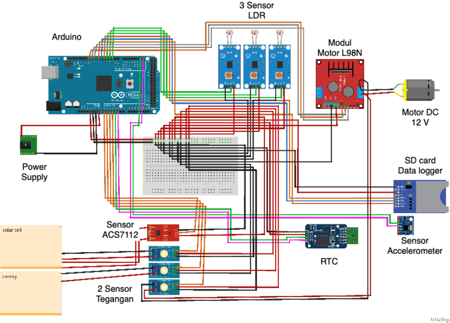 -Panel Surya: 60 WP -Motor DC 5840-31ZY-670X -Gearbox dengan rasio gigi 1:8.19 -Sensor: 3 buah LDR dan accelerometer -Kontrol: PID Tuning dengan metode Ziegler-Nichols -Driver Motor: L298N -Mikrokontroler: Arduino -Monitoring: Data logger -RTC untuk reset posisi harian -Konsumsi beban: 8 Ah per hari