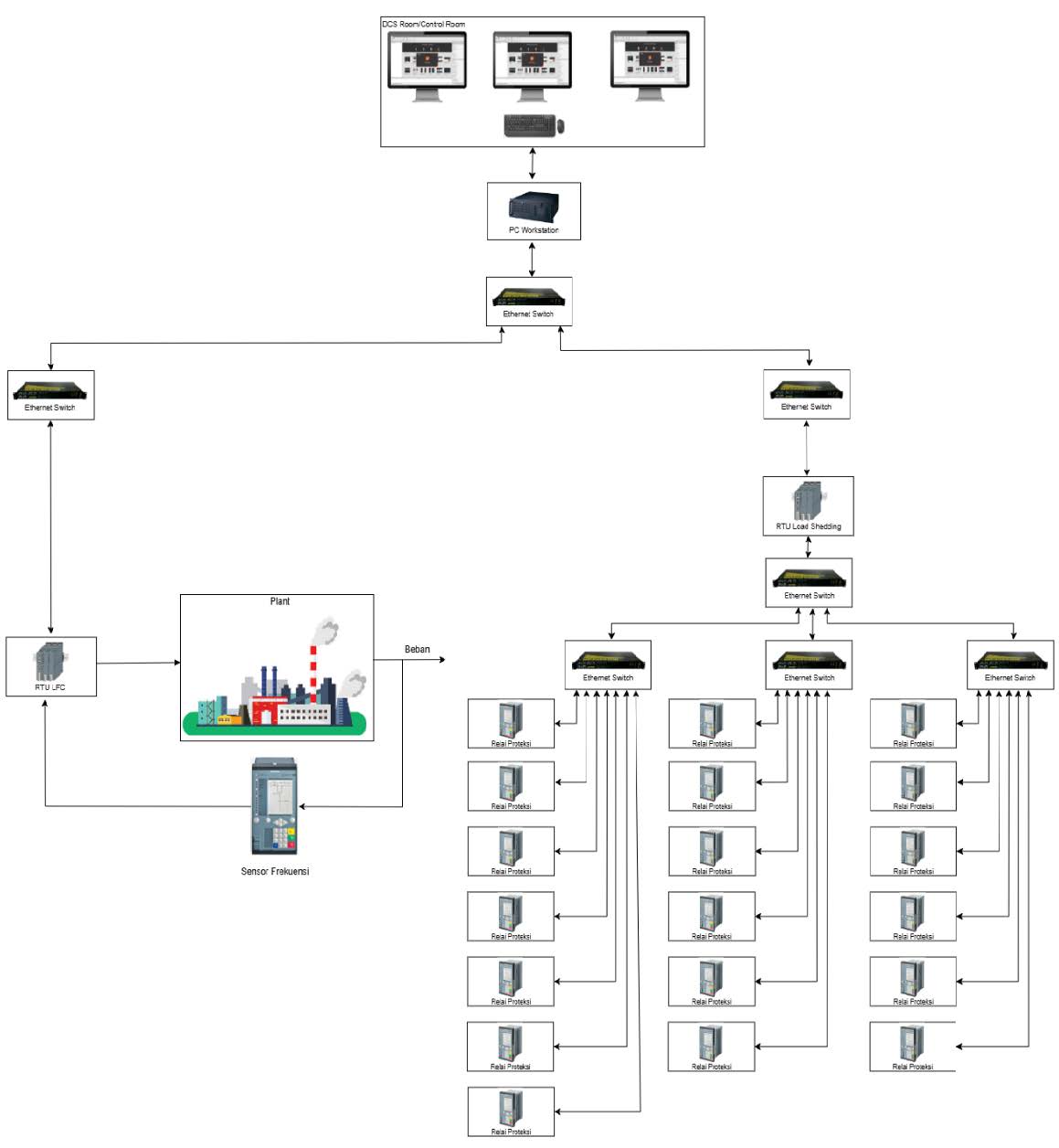 - Jenis Pembangkit: Simulator Power Generation Plant berbasis PLTU - Komponen Utama: - Governor, Turbin Uap, Generator Sinkron - Kontroler: Fuzzy Logic + PID (terintegrasi) - RTU: Siemens SICAM A8000 - Sensor Frekuensi: SIPROTEC 5 - Protokol Komunikasi: IEC 61850 (sensor ke RTU), IEC 60870-5-104 (RTU ke DCS Room) - Software Simulasi: Toolbox II - Lingkup Kontrol: Secondary control loop - Parameter Uji: Daya aktif, error steady state, overshoot, settling time - Setpoint Frekuensi: 50 Hz ± 1%
