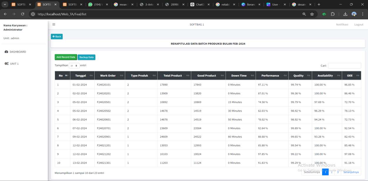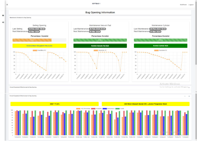 -Komponen utama yang dianalisis: Vacuum Pad: β = 6, η = 188, Mean Lifetime ≈ 175 jam, Setting Cylinder: β = 2, η = 301, Mean Lifetime ≈ 271 jam, Setting Opening: β = 2, η = 268, Mean Lifetime ≈ 239 jam. -Data: Record produksi & kegagalan Desember 2022 – Januari 2024, Validasi data: bulan Januari 2024 -Tools & Software: Excel, Python, Reliasoft+, Website monitoring berbasis dashboard -Indikator kinerja: MTTF, MTBF, OEE, dan Six Big Losses -Tampilan website mencakup: Dashboard mesin, Visualisasi keandalan komponen, Rekomendasi perawatan, Jadwal produksi