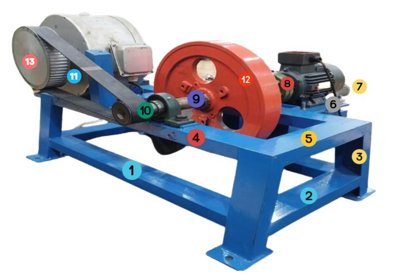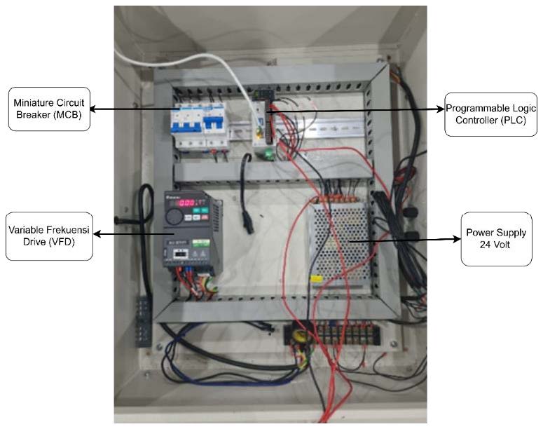 -Generator: Permanent Magnet Generator GL PMG 3500, output 50 Hz -Motor Penggerak: Motor induksi 3 fasa 1,5 kW -Beban: Variasi beban 0,75 kW, 1,5 kW, dan 4,5 kW -Kontrol: PID Controller dengan tuning parameter Kp = 10, Ki = 1, Kd = 0 -Komponen: Programmable Logic Controller (PLC), Variable Frequency Drive (VFD), HMI untuk monitoring real-time, Sensor kecepatan (Hall proximity), Sistem monitoring menggunakan grafik realtime kecepatan dan frekuensi motor,