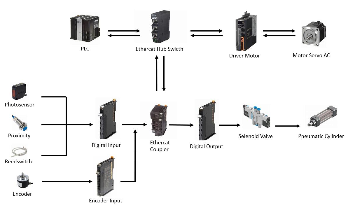 -Kontroler: PLC Omron NX102-1000 -Sensor: Encoder E6B2-CWZ5B (master axis), Photoelectric sensor, Proximity sensor, Reedswitch -Aktuator: Servo motor R88M-1L1K530T-S2, Driver servo R88D-1SN15H-ECT -Interface: Sysmac Studio -Rasio Gearing: 1:7 -Frekuensi Konveyor: Minimum 40 Hz, maksimum 100 Hz -Error Sinkronisasi: < 3 mm, rata-rata 0,8 mm atau 0,6% dari total perpindahan -Response Time Servo: 260 ms