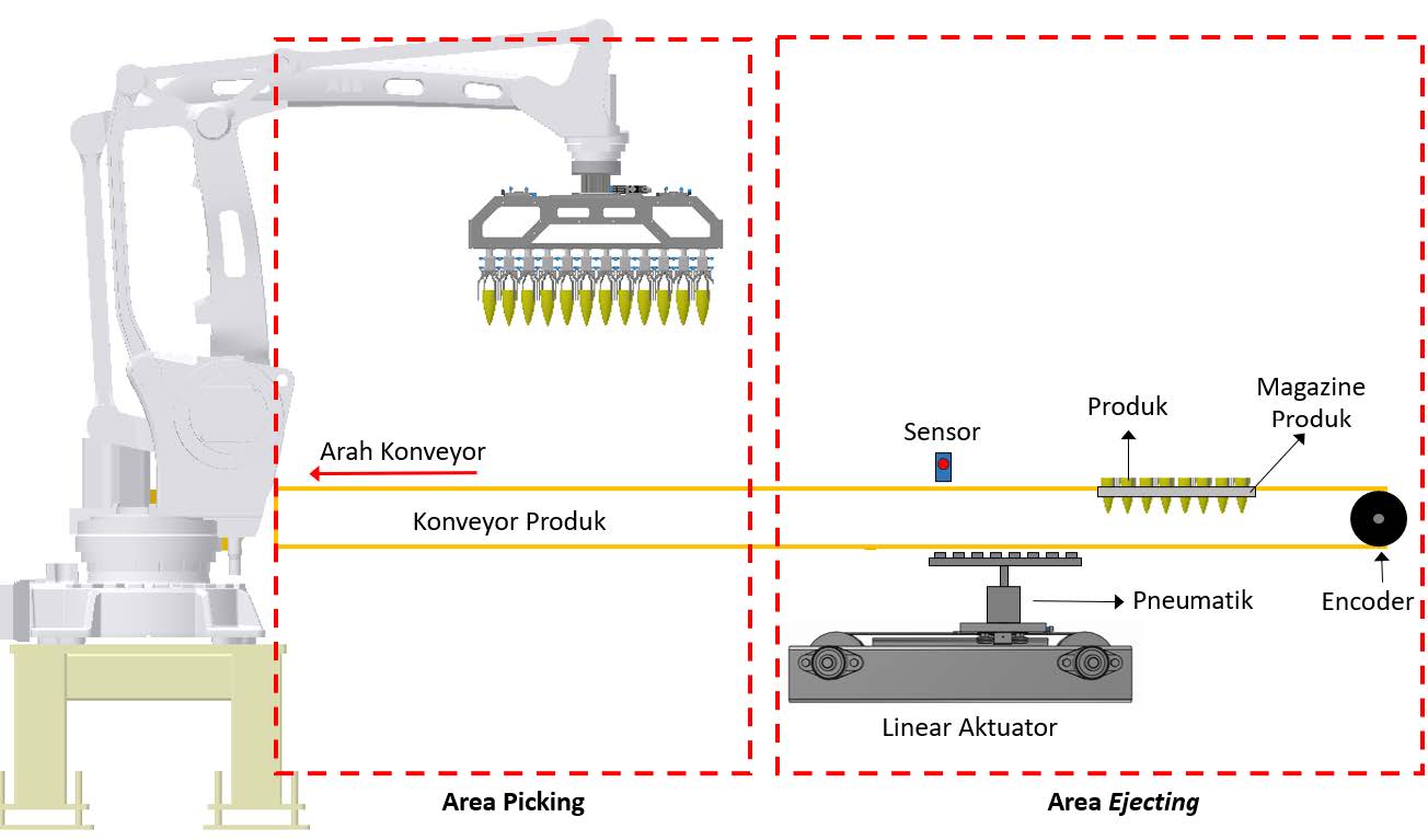 Proyek ini bertujuan untuk mengatasi masalah sinkronisasi posisi antara produk pada konveyor dengan linear aktuator yang digunakan untuk proses ejecting dalam sistem Robotic Corn Feeder. Produk berupa es krim cenderung menempel pada konveyor karena suhu dingin, sehingga membutuhkan proses ejecting sebelum diambil oleh robot. Untuk menghasilkan sinkronisasi yang presisi antara pergerakan konveyor dan aktuator, digunakan metode electronic gearing yang mengintegrasikan pembacaan encoder pada konveyor sebagai master axis dan servo motor sebagai slave axis. Kontrol dilakukan oleh PLC Omron untuk memastikan pergerakan yang seragam antara produk dan aktuator.