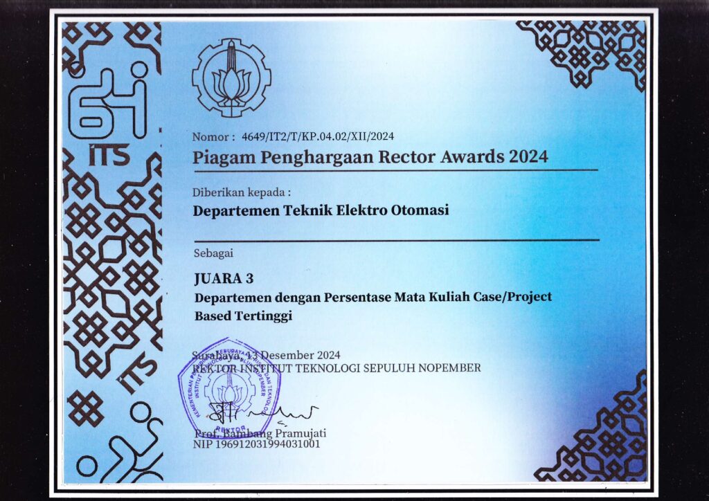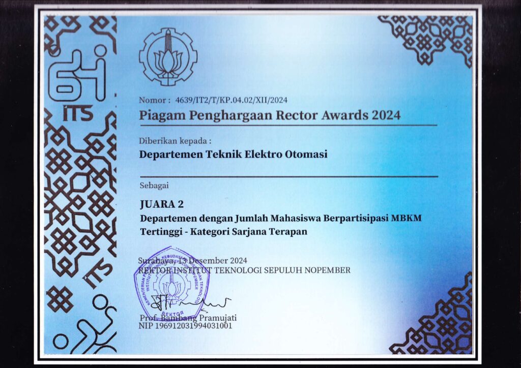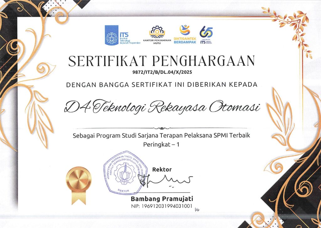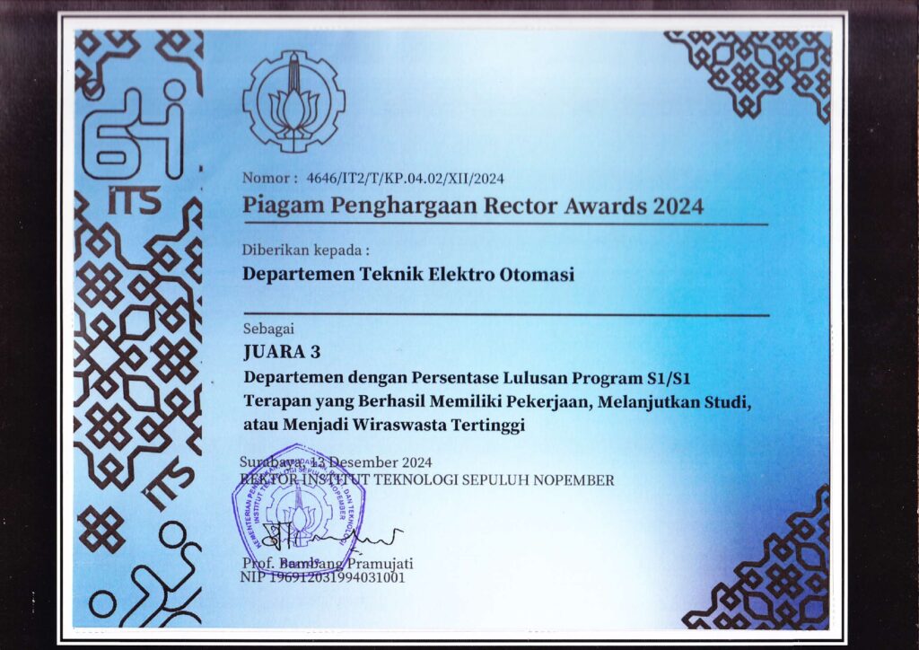 Departemen Teknik Elektro Otomasi selalu berupaya menjadi Departemen yang unggul dalam bidangnya, melalui nilai-nilai yang ditanamkan diantaranya Ekselensi, Kepemimpinan Kuat serta Sinergi. Pada tahun 2021 Departemen Teknik Elektro berhasil memperoleh peringkat ke-3 sebagai Program Studi Sarjana Terapan Pelaksana SPMI Akademik dan Kemahasiswaan Terbaik.