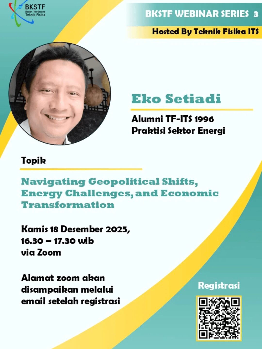 Webinar “Navigating Geopolitical Shifts, Energy Challenges, and Economic Transformation” menghadirkan Eko Setiadi, alumni Teknik Fisika ITS angkatan 1996 dan praktisi berpengalaman di sektor energi, sebagai pembicara utama. Diselenggarakan oleh Badan Kerja Sama Teknik Fisika (BKSTF) dan Teknik Fisika ITS. Acara akan berlangsung secara daring melalui Zoom pada Kamis, 18 Desember 2025, pukul 16.30–17.30 WIB.