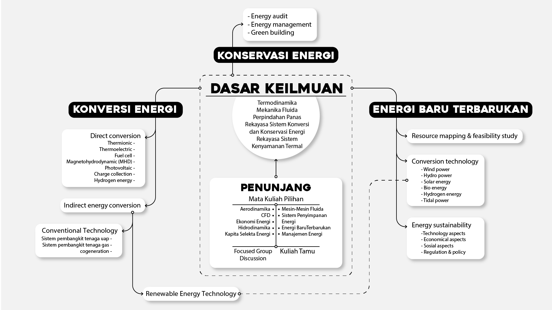 Each member of the laboratory is required to follow a roadmap (ROADMAP) for both research and non-research activities. The Roadmap contained in the Laboratory is divided into 3 (three) main focuses, namely New Renewable Energy, Energy Conversion and Energy Conservation. The things that will be studied in the lab, both theoretical and practical, include thermodynamics, fluid mechanics, heat transfer, etc.