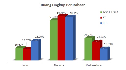 Responden Teknik Fisika yang bekerja di perusahaan nasional memiliki persentase sebesar 53.7%. Angka tersebut tidak jauh berbeda dengan rata-rata persentase lulusan FTI dan ITS. Perusahaan multinasional dipilih oleh 29.63% lulusan Teknik Fisika, lebih banyak dari rata-rata lulusan FTI maupun ITS. Sisanya, sekitar 16.67% lulusan Teknik Fisika memilih untuk bekerja di perusahaan lokal.