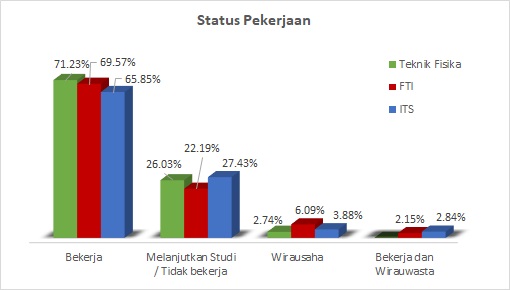 Persentase rata-rata responden Departemen Teknik Fisika, FTI, dan ITS yang bekerja berada pada kisaran 66% hingga 72%. Lulusan Departemen Teknik Fisika yang bekerja memiliki rata-rata lebih tinggi dibanding mahasiswa ITS ataupun FTI. Responden yang memilih melanjutkan studi atau tidak bekerja cenderung lebih sedikit yaitu pada kisaran 22% hingga 27%, dengan lulusan Teknik Fisika yang melanjutkan studi sebanyak 26% dari total lulusan. Disisi lain, 2.74% lulusan Teknik Fisika memilih untuk berwirausaha.