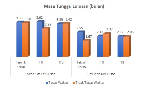 Berikut menunjukkan rata-rata masa tunggu responden Departemen Teknik Fisika sebelum mendapat pekerjaan pertama. Dengan proses pencarian kerja dimulai baik sebelum atau sesudah kelulusan. Rata-rata waktu tunggu bagi mahasiswa Teknik Fisika, FTI, dan ITS yang mencari kerja sebelum kelulusan adalah 2.9 hingga 3.5 bulan. Untuk mehasiswa yang mulai mencari kerja setelah kelulusan, waktu tunggu cukup bervariasi. Mahasiswa Teknik Fisika memiliki waktu tunggu yang cukup singkat yaitu 2.5 bulan (lulus tepat waktu) dan 1.6 bulan (lulus tidak tepat waktu).