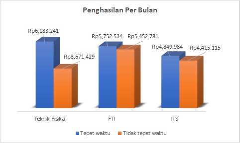 Secara umum, responden yang menyelesaikan studinya tepat waktu cenderung memiliki penghasilan yang lebih tinggi. Penghasilan yang diperoleh responden Departemen Teknik Fisika yang lulus tepat waktu sebesar Rp 6,1 juta, lebih tinggi dibandingkan penghasilan rata-rata responden FTI dan ITS yang lulus tepat waktu. Sedangkan responden dengan kelulusan tidak tepat waktu memperoleh penghasilan yang signifikan perbedaannya yaitu Rp 3,6 juta. Perbedaan penghasilan rata-rata responden yang lulus tepat waktu dan tidak tepat waktu cukup tinggi, walaupun perbedaan pada responden FTI dan ITS tidak terlalu signifikan.