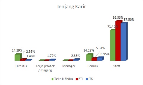 Responden yang memiliki karir sebagai staff menunjukkan persentase yang sangat tinggi dibandingkan jenjang karir yang lain. Pada Departemen Teknik Fisika, 71.43% lulusan bekerja sebagai staf. Selain itu, 14.29% responden memiliki jenjang karir sebagai direktur, manager, atau pemilik perusahaan.