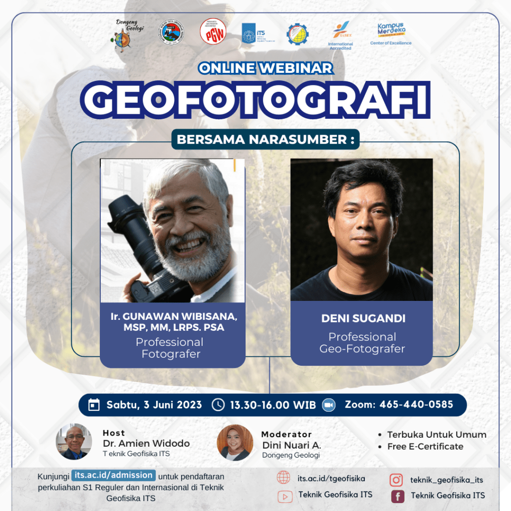 Teknik Geofisika ITS berkolaborasi dengan Dongeng Geologi, Masyarakat Geologi Tata Lingkungan (MAGETI), Pemandu Geowisata Indonesia (PGWI) menyelenggarakan webinar dengan topik “Geofotografi”, mengundang narasumber: