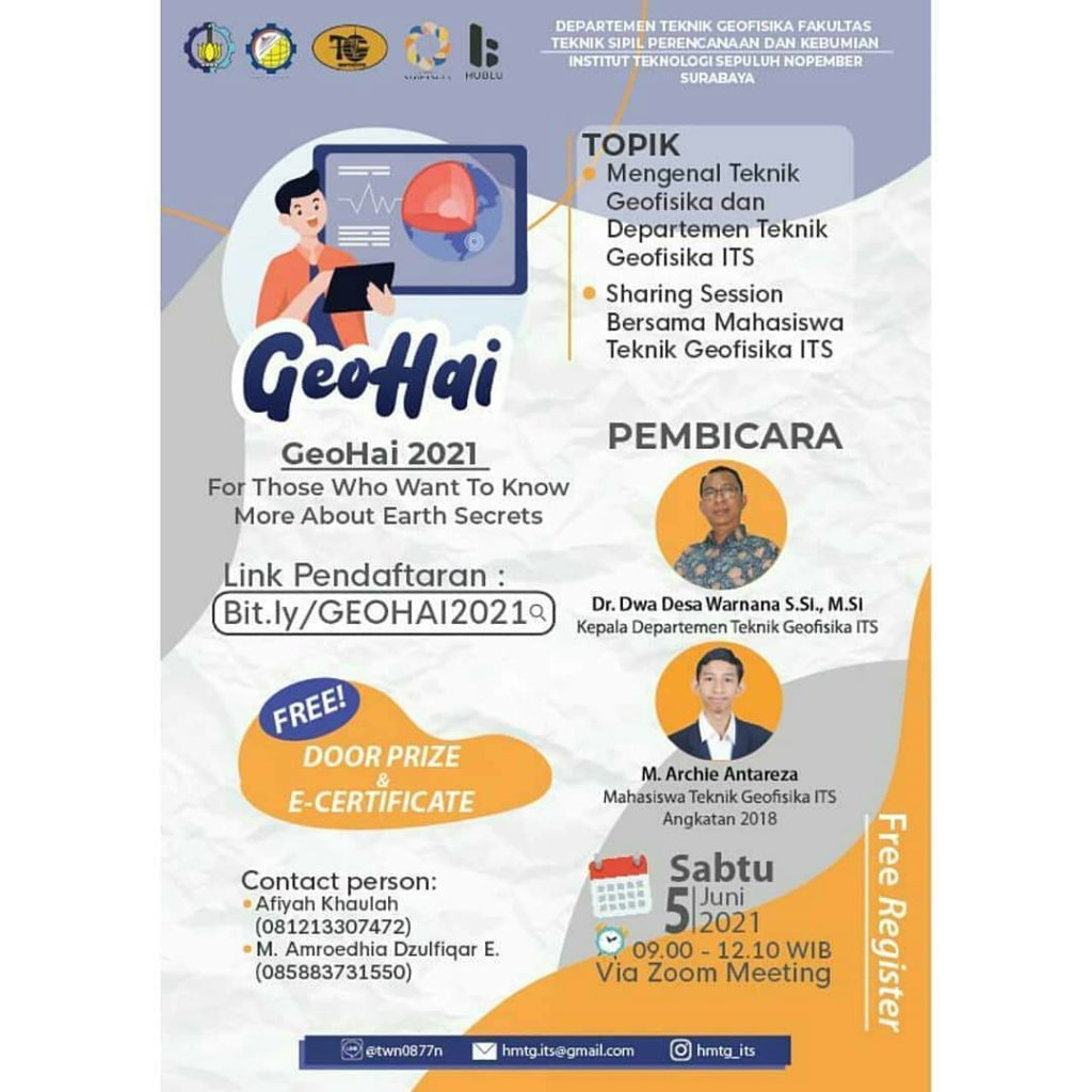 Nah, tahukah kalian apa itu Teknik Geofisika? Jurusan ini terhitung underrated, jarang yang mengetahui namun memiliki prospek yang sangat bagus. Luangkan waktumu untuk menghadiri GeoHai. Acara ini akan memberikan pandangan baru mengenai apa yang dipelajari beserta prospek Teknik Geofisika dan juga sharing session bersama mahasiswa Teknik Geofisika ITS. Jangan lewatkan kesempatan ini dan segera daftarkan diri kalian dengan klik link bit.ly/GEOHAI2021
