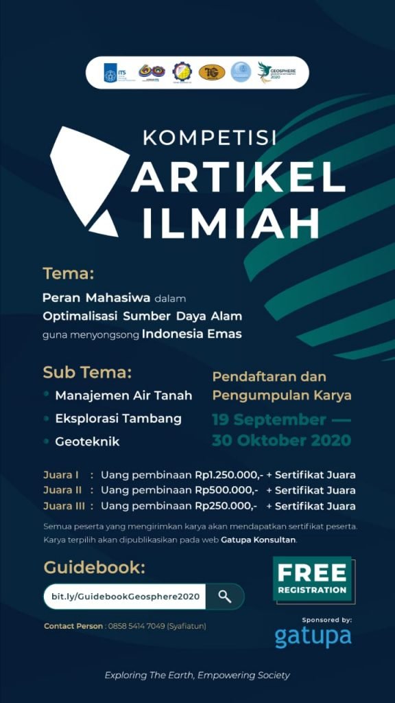 2. KOMPETISI ARTIKEL ILMIAH * Tema: Peran Mahasiswa dalam Optimalisasi Sumber Daya Alam dalam menyongsong Indonesia Emas * Sub tema: – Manajemen Air Tanah – Eksplorasi Tambang – Geoteknik * Pendaftaran dan Pengumpulan Karya: 19 September – 30 Oktober 2020 * Untuk informasi lebih lanjut, langsung cek guide book nya di bit.ly/GuidebookGeosphere2020