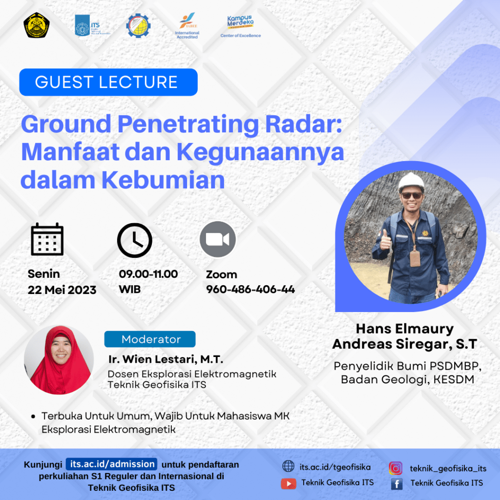 Teknik Geofisika ITS menyelenggarakan kuliah tamu dengan topik “Ground Penetrating Radar: Manfaat dan Kegunaannya Dalam Kebumian”, bersama narasumber: