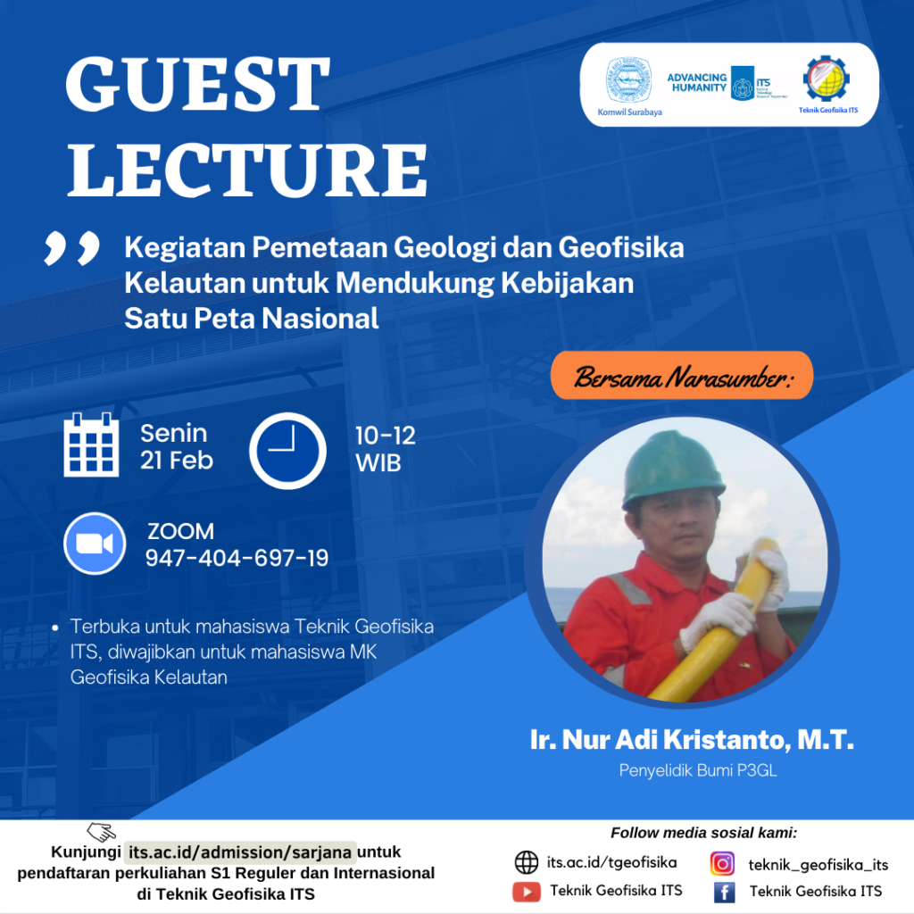 ITS Geophysical Engineering will have a guest lecture with the topic “Kegiatan Pemetaan Geologi dan Geofisika Kelautan untuk Mendukung Kebijakan Satu Peta Nasional“, inviting resource speaker: