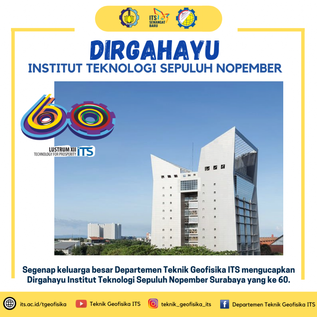Segenap keluarga besar Departemen Teknik Geofisika ITS mengucapkan Dirgahayu Institut Teknologi Sepuluh Nopember Surabaya yang ke 60.