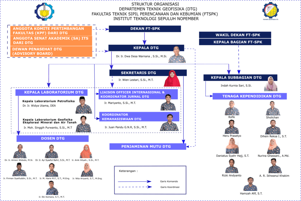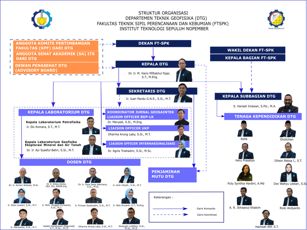 Organisasi Departemen Teknik Geofisika (DTG) mengacu Perek ITS no.25 tahun 2019 tentang OTK Fakultas di lingkungan ITS dimana dalam menjalankan kegiatan operasionalnya DTG telah membentuk struktur organisasi yang kompatibel dengan struktur organisasi Institut Teknologi Sepuluh Nopember Surabaya. Dalam pelaksanaan program, Kepala Departemen dibantu oleh Sekretaris Departemen, Kepala Laboratorium yang bertanggung jawab atas kepemimpinan operasional di laboratorium, Koordinator Kemahasiswaan yang bertanggung jawab atas pengelolaan kegiatan kemahasiswaan, Liason Officer yang bertanggung jawab atas pengelolaan kegiatan internasional, Koordinator Jurnal yang bertanggung jawab atas pengelolaan jurnal Geosaintek, dan Kasubbag yang bertanggung jawab atas kepemimpinan terhadap tenaga kependidikan. Dalam pengendalian dan penjaminan mutu bidang akademik, terdapat Penjaminan mutu departemen yang diketuai oleh Sekretaris Departemen dan dibantu ketua RMK/Kalab.