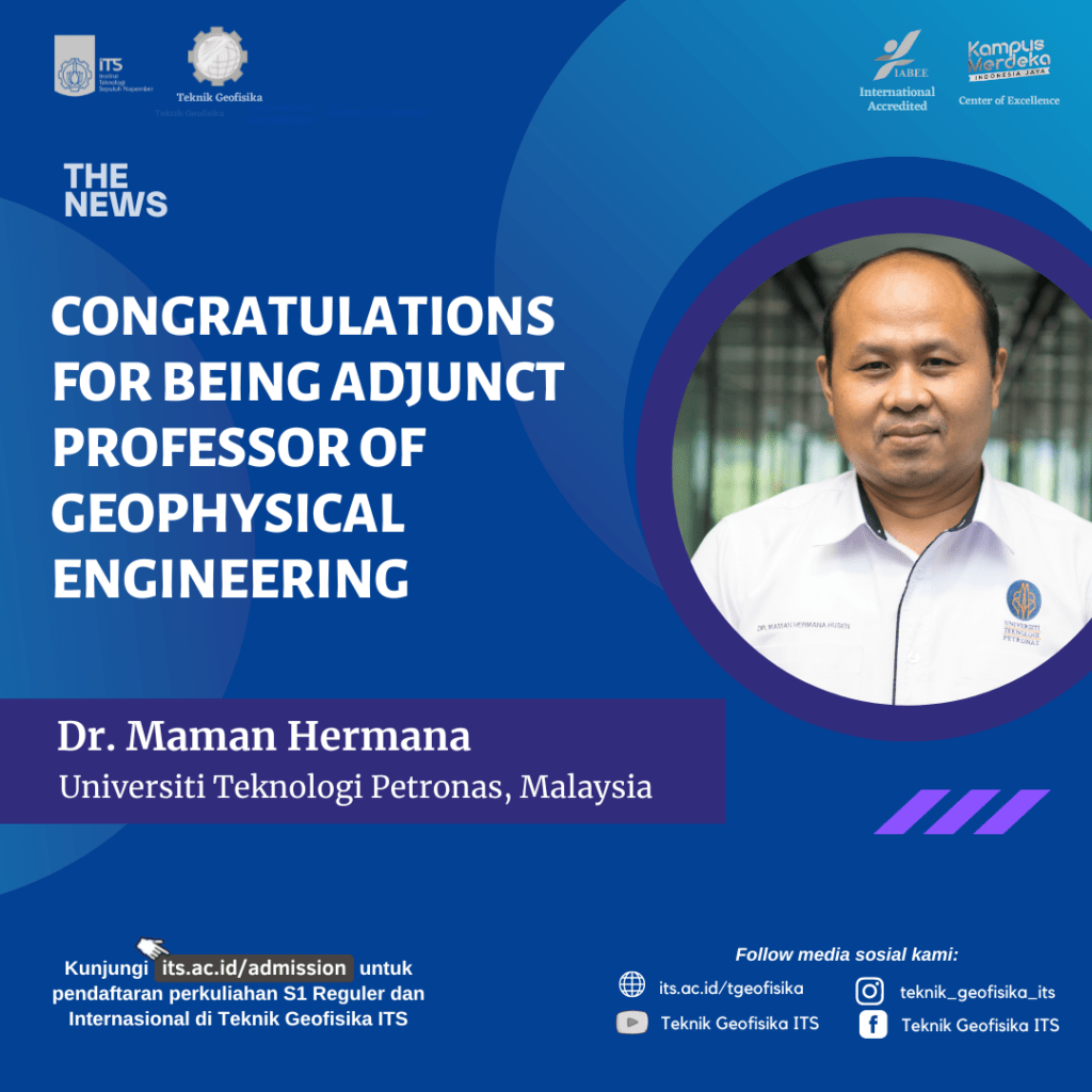 Teknik Geofisika ITS mengucapkan selamat kepada Petroleum Geosciences, Universiti Teknologi Petronas, atas pengukuhan Dr. Maman Hermana sebagai Adjunct Professor ITS. Profesor Ajun didefinisikan sebagai profesor yang direkrut berdasarkan kontrak. Adjunct professor di ITS dapat memilih salah satu dari dua jenis: komitmen berbasis pengajaran atau berbasis penelitian/publikasi.