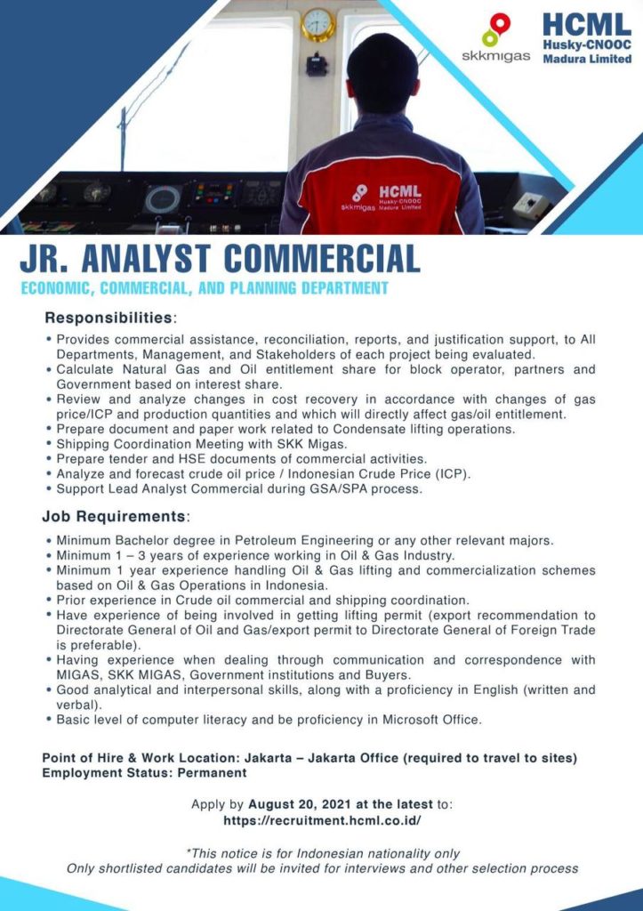 Husky-CNOOC Madura Limited yang merupakan salah satu Kontraktor Kontrak Kerja Sama (KKKS) dari SKK Migas, membuka peluang kepada talenta bangsa terbaik untuk bergabung dalam posisi Jr. Analyst Commercial.