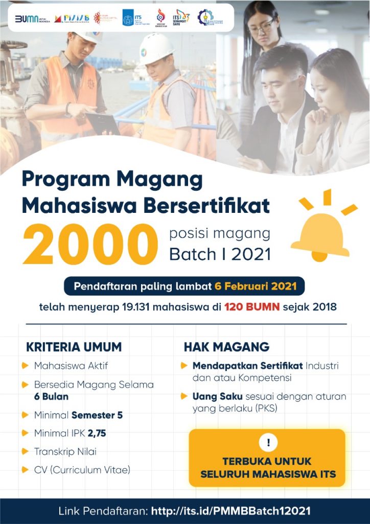 ITS menawarkan sebuah program magang untuk mahasiswa ITS yang sedang menjalani perkuliahan di semester 5 dan 7. Program yang bernama Program Magang Bersertifikat ini akan menempatkan mahasiswa yang terpilih untuk di berbagai BUMN. Silakan simak syarat dan ketentuannya di poster berikut ini