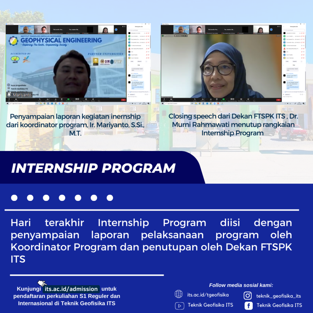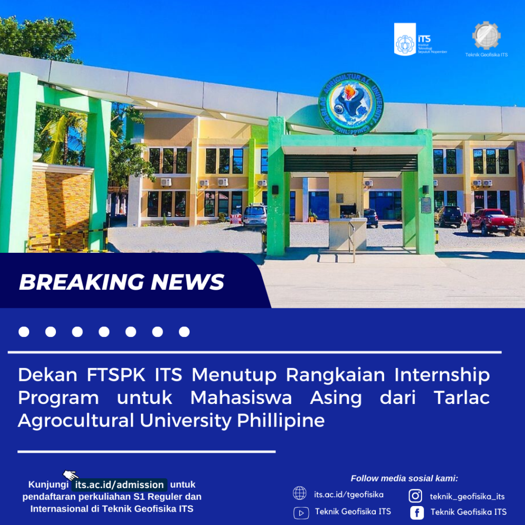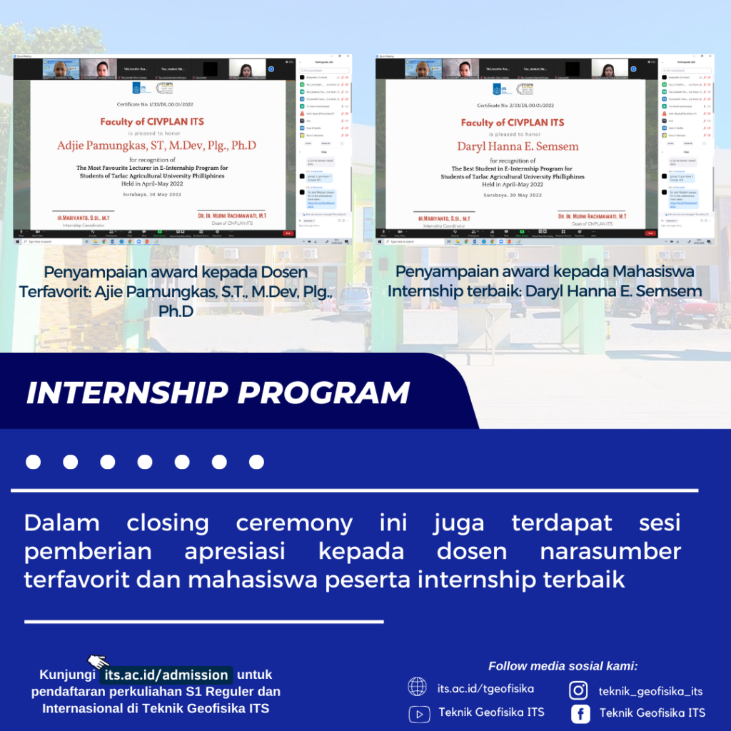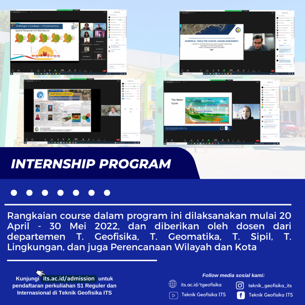 Fakultas CIVPLAN ITS memberikan Program Magang bagi mahasiswa Tarlac Agricultural University Phillipine yang dimulai dari tanggal 20 April sampai dengan 30 Mei 2022. Menyampaikan topik Disaster Management, ada 5 departemen yang terlibat dalam memberikan kuliah online kepada mahasiswa magang, terdiri dari Teknik Geofisika, Teknik Geomatika, Teknik Sipil, Teknik Lingkungan, dan Perencanaan Wilayah & Kota.