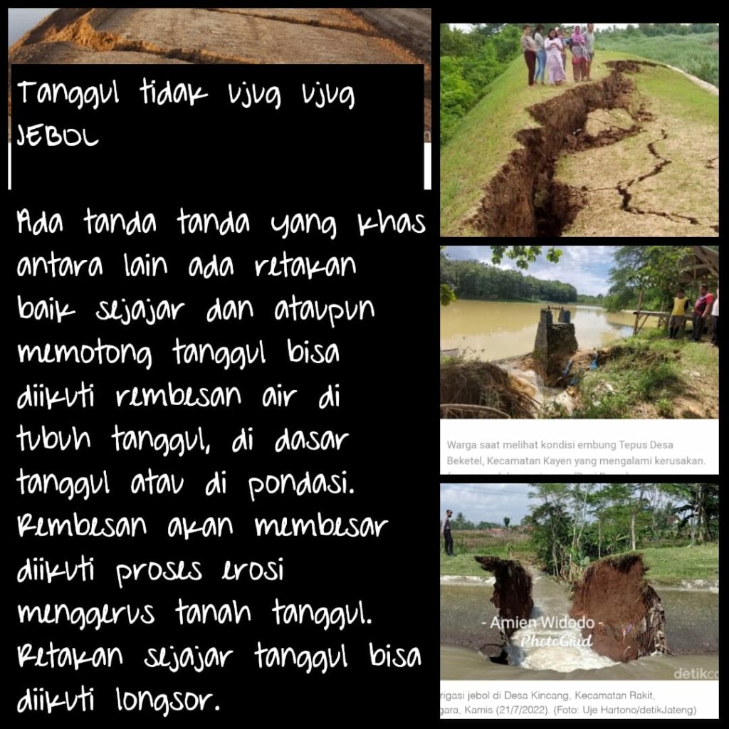 Hujan masih akan terus berlangsung dan akan maksimum bulan Februari-Maret 2024 untuk itu kepada semua masyarakat yang bermukim atau sedang ada di TANGGUL SUNGAI/EMBUNG/SITU/DANAU/RANU dsb mulailah mewaspadai bila tanggul menunjukkan tanda tanda sebagai berikut : 1. Permukaan air sejajar tanggul atau sudah melimpah melebihi tanggul (over topping) 2. Ada rembesan air di tubuh tanggul dan atau di dasar tanggul atau di pondasi di bawah tanggul. 3. Ada retakan baik sejajar dan ataupun memotong tanggul 4. Ada erosi di permukaan tanggul, saat hujan akan semakin melebar dan semakin dalam 4. Ada longsor di bagian dalam/luar tanggul dan atau di dasar tanggul 5. Ada pergeseran tanggul