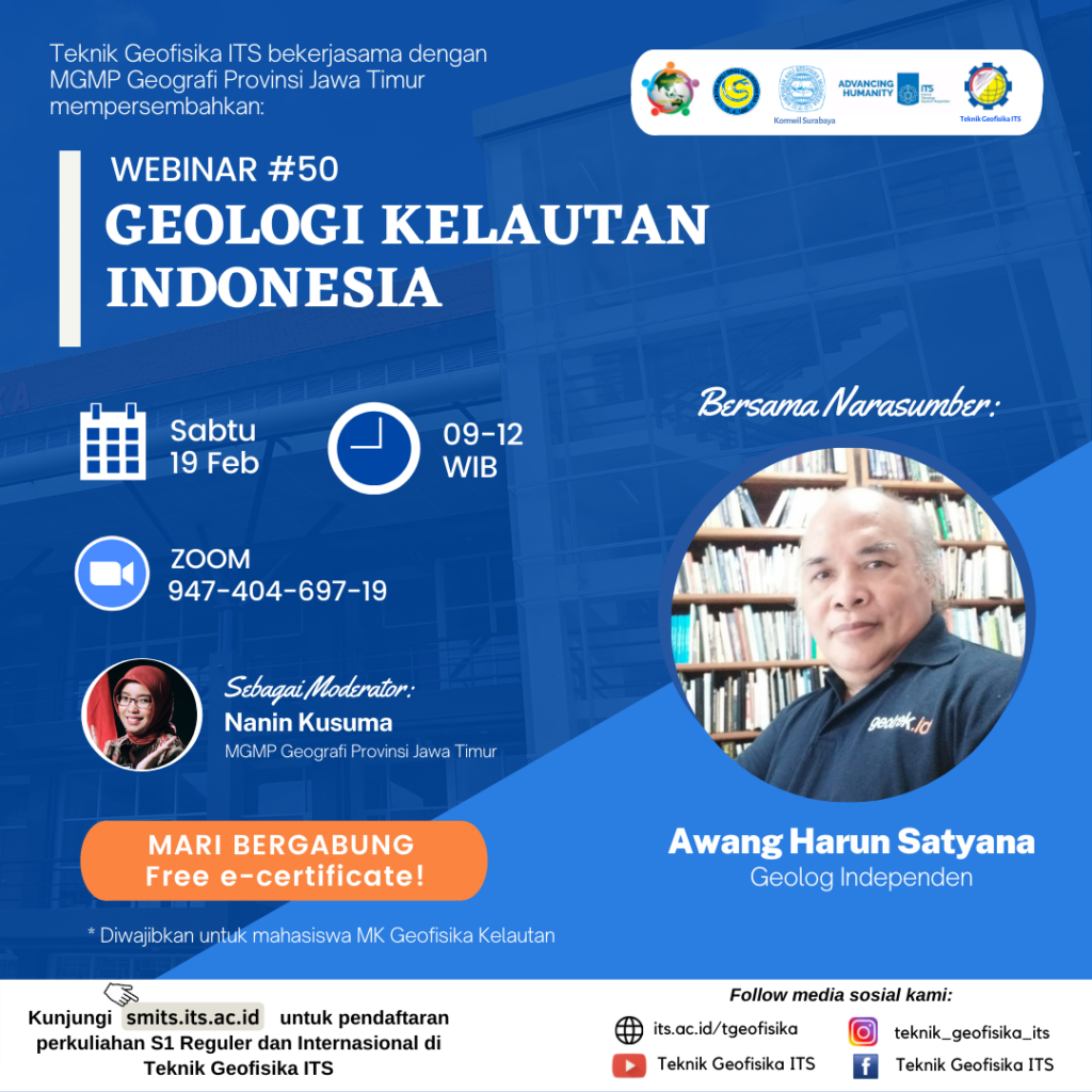 Webinar “Geologi Kelautan Indonesia” ini akan menghadirkan cerita tentang geologi kelautan secara umum dan kasusnya di Indonesia, masa depan, dan tantangannya.