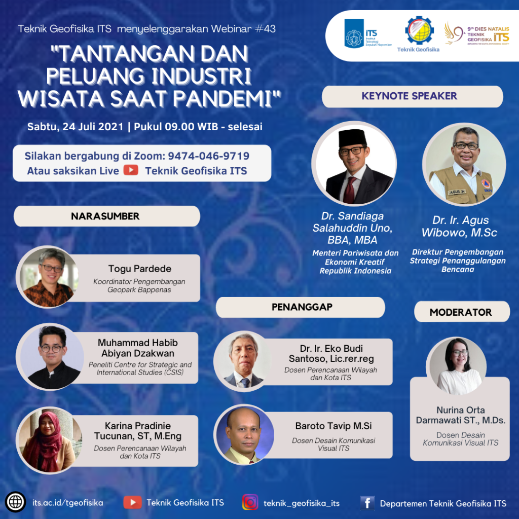 Sesuai dengan Misi ITS memberikan kontribusi dalam ilmu pengetahuan dan teknologi untuk kesejahteraan masyarakat melalui kegiatan pendidikan, penelitian, pengabdian kepada masyarakat dan manajemen yang berbasis teknologi informasi dan komunikasi, maka kami Departemen Teknik Geofisika ITS bekerjasama dengan Bappenas dan Disaster Management Research Unit CSIS menyelenggarakan WEBINAR dengan tema: Tantangan dan Peluang Industri Wisata Saat Pandemi