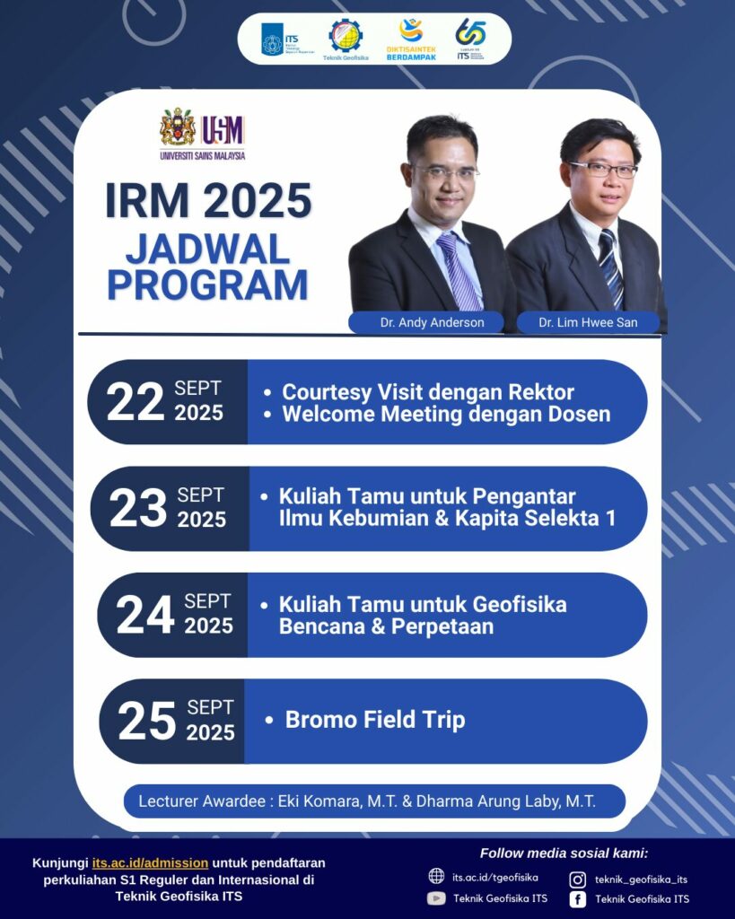 Department of Geophysical Engineering ITS has successfully held a international event inviting 2 associate professors from Malaysia. Dr. Lim Hwee San and Dr. Andy Anderson Anak Berry, from Universiti Sains Malaysia, was visiting ITS Geophysical Engineering started from 21-26 September 2025.