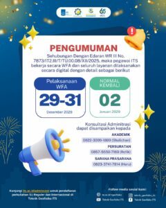 Sehubungan Dengan Edaran WR III No. 7873/IT2.III/T/TU.00.08/XII/2025, maka pegawai ITS bekerja secara WFA dan seluruh layanan dilaksanakan secara digital pada 29-31 Desember 2025, kemudian layanan kembali normal mulai 2 Januari 2025.