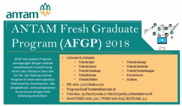 Antam Fresh Graduate Program (AFGP) 2018 atau AFGP Merupakan program pemagangan dengan metode pembelajaran inovatif yang terdiri dari theory in class dan on the job traninig activity.