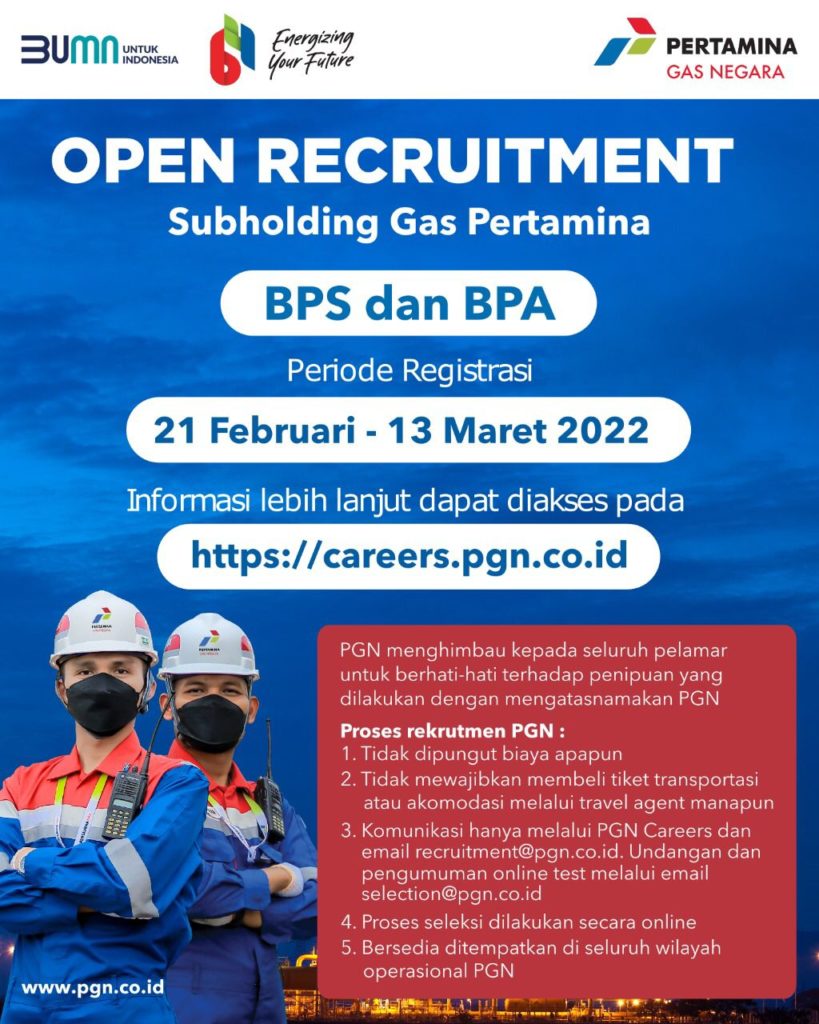 Rekrutmen dibuka mulai 21 Februari-13 Maret 2022, dan informasi lebih lanjut mengenai persyaratannya dapat diakses melalui careers.pgn.co.id