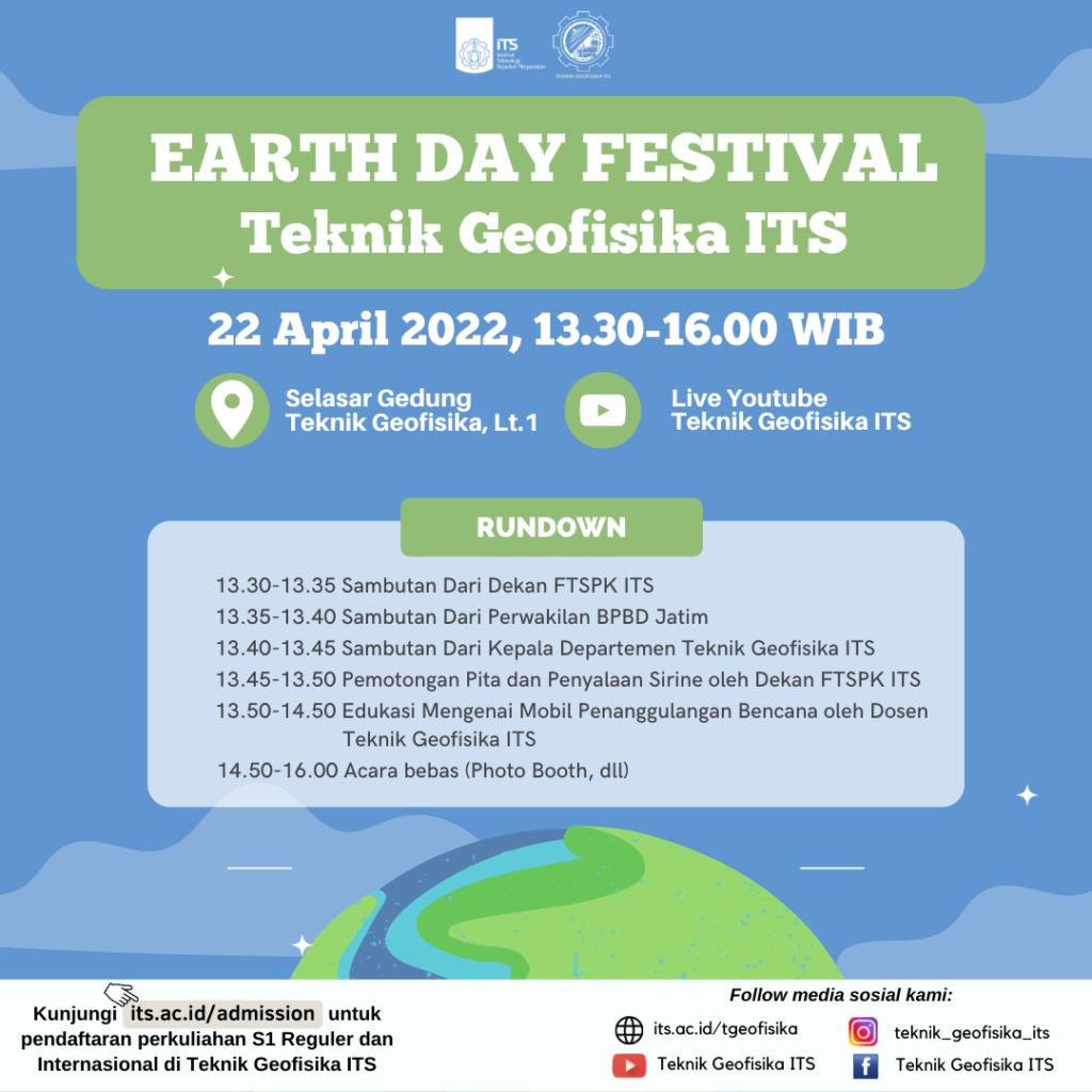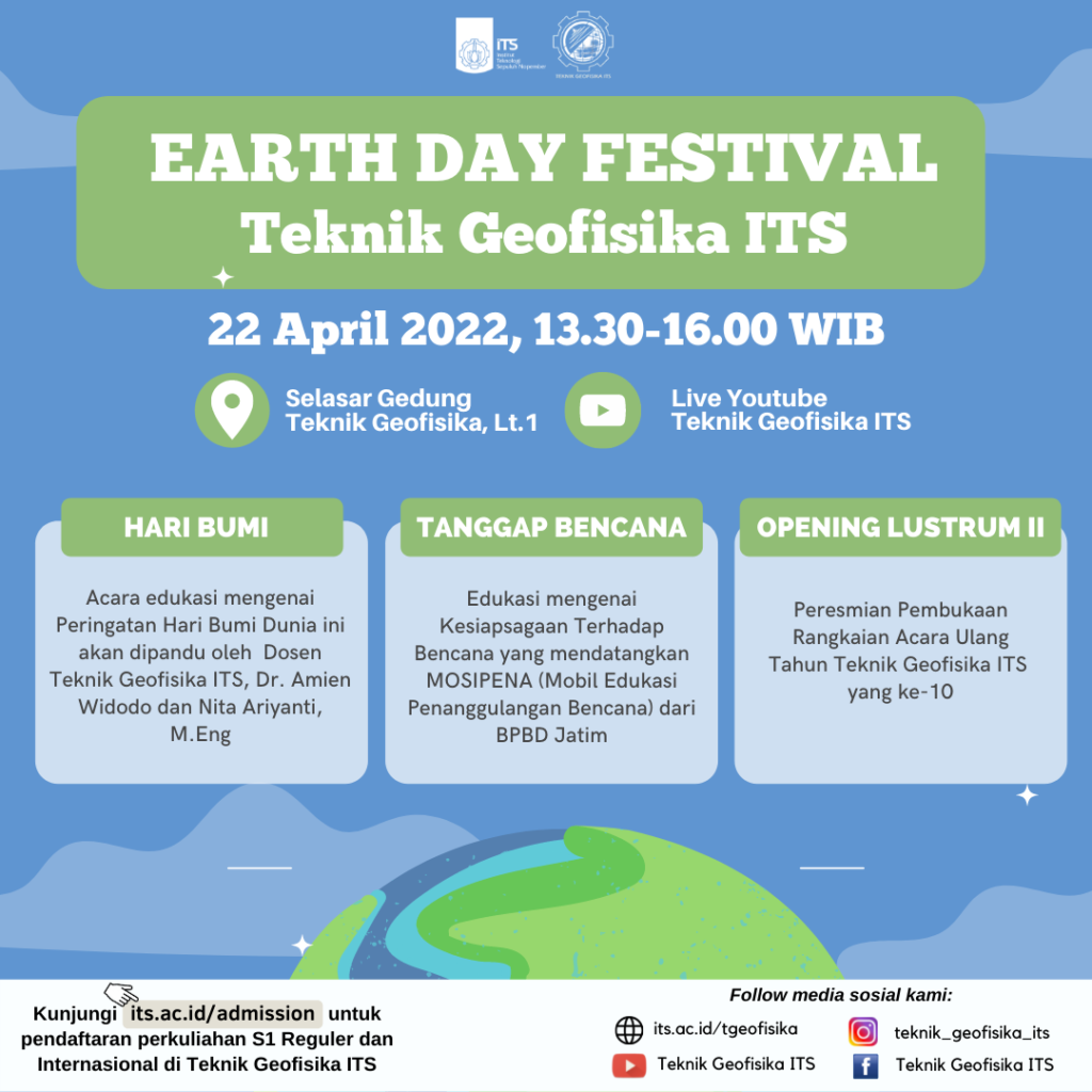 Memperingati HARI BUMI INTERNASIONAL, 22 APRIL 2022, Teknik Geofisika ITS mengajak Dosen, Tendik, Mahasiswa di lingkungan FTSPK untuk meramaikan Acara Peringatan Hari Bumi Internasional ini.