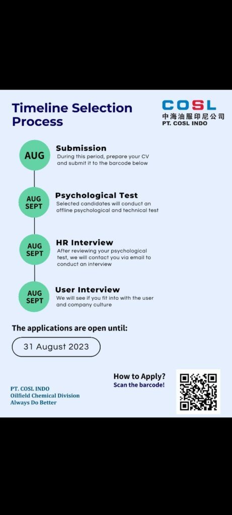 PT.COSL INDO, perusahaan jasa ladang minyak terintegrasi terkemuka di Indonesia, membuka peluang bagi talenta-talenta terbaik untuk bergabung melalui Open Recruitment.