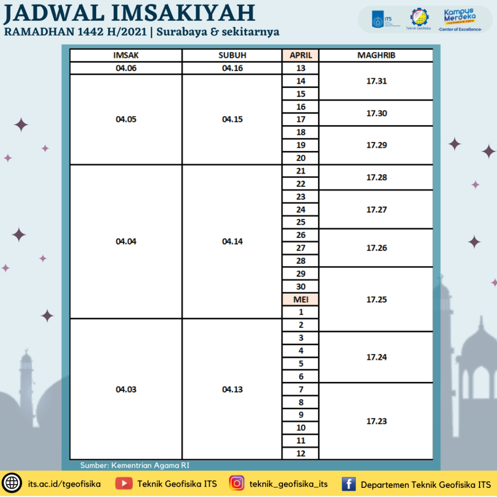 #JadwalImsakiyah #JadwalImsakiyahSurabaya #ImsakiyahSurabaya #Ramadhan1442H #Ramadhan2021 #TeknikGeofisikaITS #GeophysicalEngineeringITS #TeknikGeofisika #GeophysicalEngineering #FTSPK #InstitutTeknologiSepuluhNopember #ITS