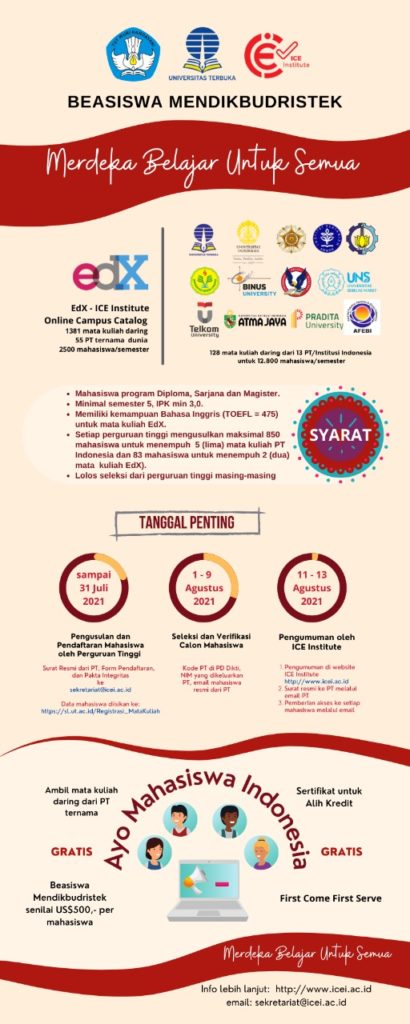Kemdikbudristek open the opportunity for Indonesian student to join an online course with scholarship. The program name is “Merdeka Belajar Untuk Semua ” which is in partner with EdX – ICE Institute.