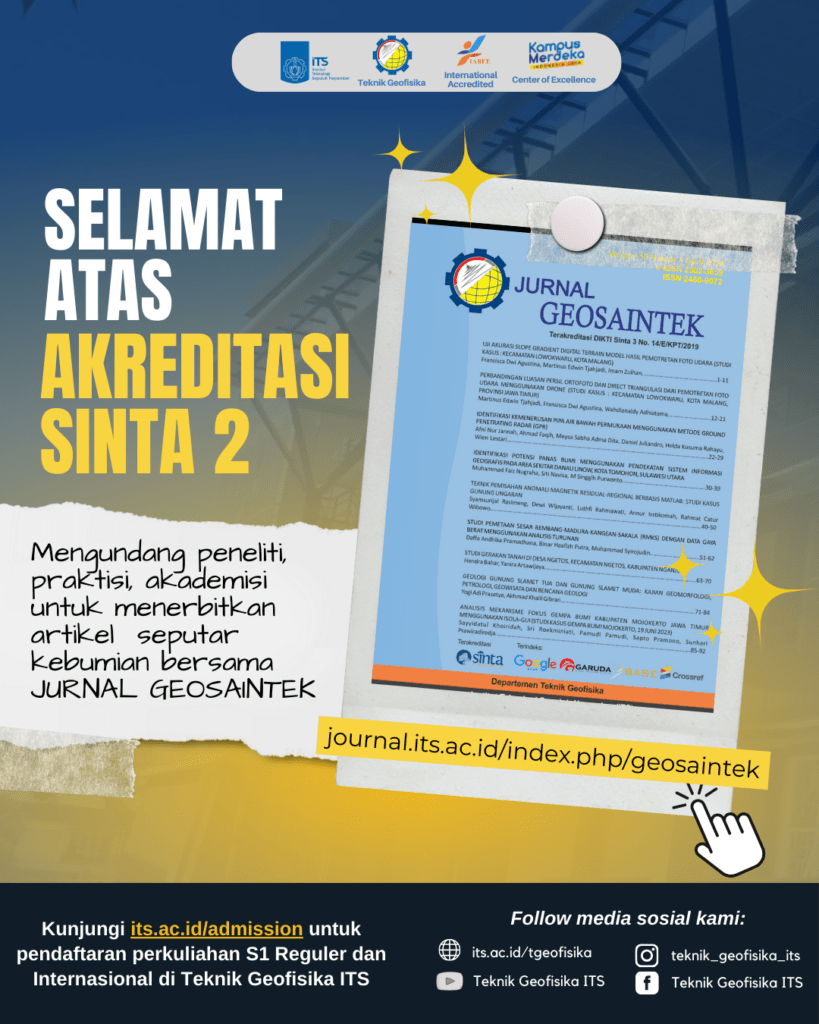 Alhamdulillah telah menjalani akreditasi nasional dan sukses mendapatkan predikat tertinggi, SINTA 2. Semoga menjadi jurnal yang semakin menginspirasi para peneliti, akademisi, praktisi dalam bidang kebumian.