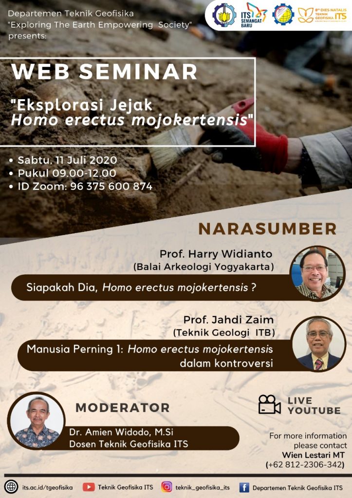 Untuk itu dalam rangka Dies Natalis ke-8 Departemen Teknik Geofisika ITS mempersembahkan : WEBINAR EKSPLORASI JEJAK HOMO ERECTUS MOJOKERTENSIS Narasumber 1. Prof. Harry Widianto (Arkeolog) 2. Prof. Jahdi Zaim (Paleontolog) Moderator : Dr. Amien Widodo