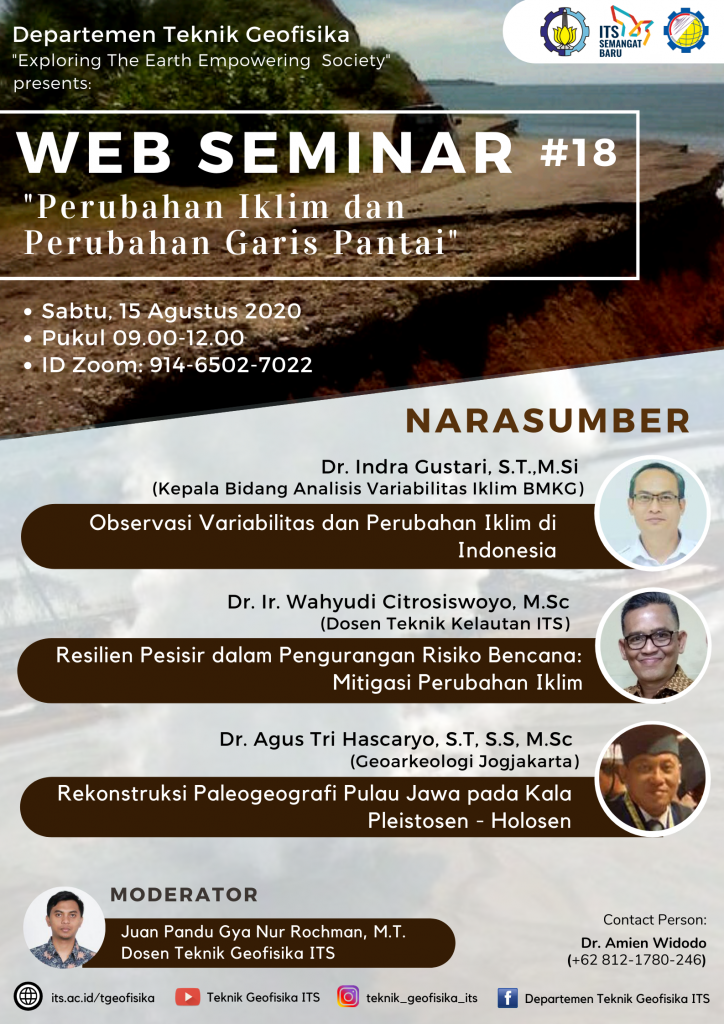Salah satu misi ITS untuk berkontribusi dalam ilmu pengetahuan dan teknologi untuk kesejahteraan masyarakat melalui kegiatan seminar daring ini akan menghadirkan para ahli dalam bidang perubahan iklim dari BMKG, ahli geoarkeologi dan ahli geologi laut yaitu :