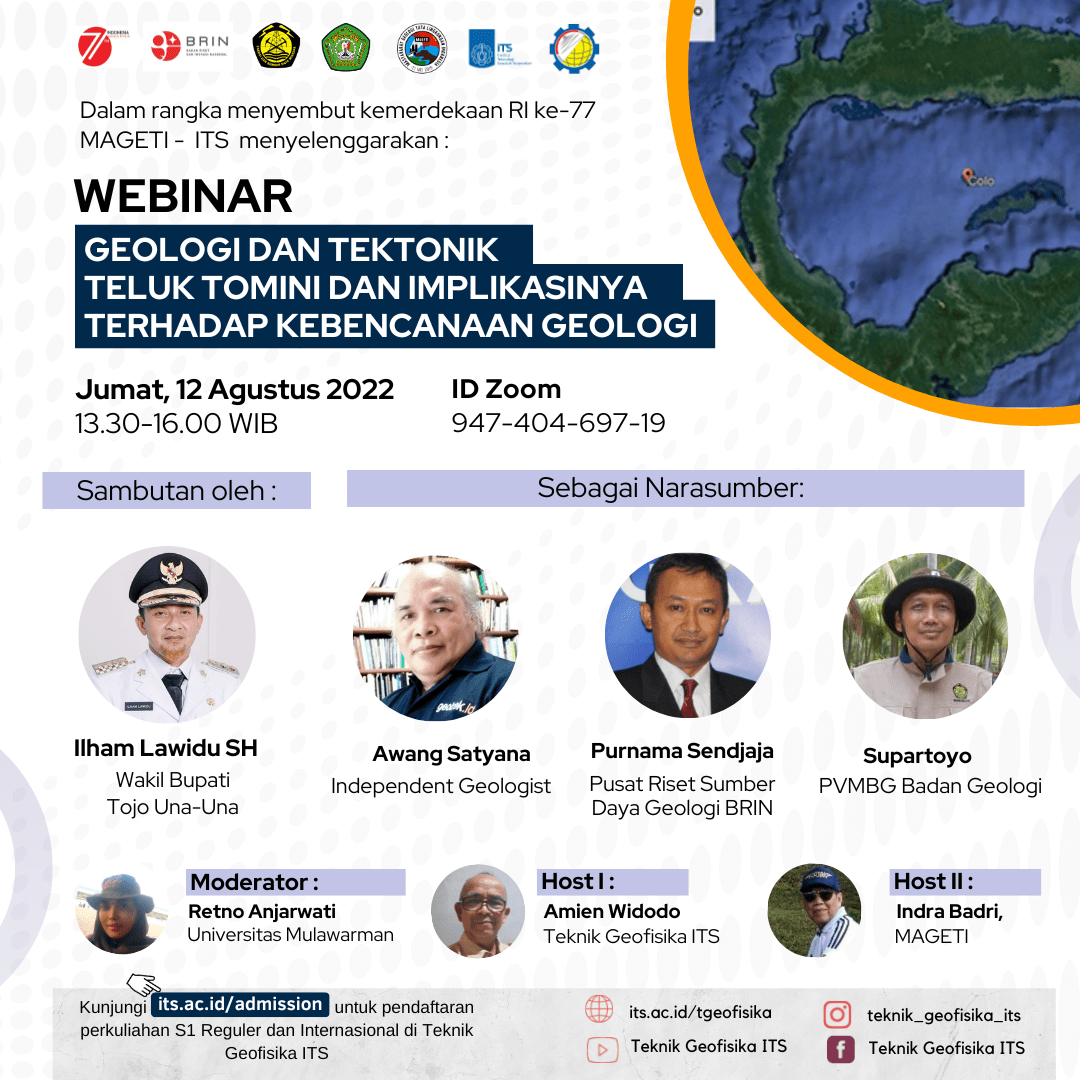Tomini Bay or also known as the Gorontalo Basin, Sulawesi is the deepest and widest bay in Indonesia. Not much was known about the geology of Tomini Bay until the eruption of Mount Colo in the middle of the bay and destroyed three quarters of this volcanic island (Una-Una Island) in 1983. This massive eruption was preceded by tectonic earthquakes and then months of volcanic activity. previously that made the population at that time leave the island, so that when a major eruption occurred there were no more residents living on the island.The Colo Volcano and the Togian Islands were not understood geologically until more detailed mapping and studies were carried out in this area. Regional and detailed seismic surveys were also carried out throughout the Tomini Bay area. Analysis and interpretation of these data provides an overview of the geology and tectonics of Tomini Bay, as well as the occurrence of Mt. Colo and the Togian Islands. Although later there were some differences of opinion regarding these matters, these data are useful for understanding the geology and tectonics of Tomini Bay and mitigating geological disasters in this region (volcanic eruptions, earthquakes, tsunamis).To discuss the geology and tectonics of Tomini Bay, the volcanism of Mt. Colo/Una-Una, and the earthquake and tsunami potential in this region, as well as in commemoration of the 77th independence of the Republic of Indonesia, ITS Geophysical Engineering in collaboration with MAGETI held a Webinar:“Geologi dan Tektonik Teluk Tomini dan Implikasinya terhadap Kebencanaan Geologi”which will be opened by speech from:👤 Ilham Lawidu (Wakil Bupati Tojo Una-Una) and the resource speakers are:👤 Awang Satyana (Independen Geologist) 👤 Purnama Sanjaya (Pusat Riset Sumber Daya Geologi BRIN) 👤 Supartoyo (PVMBG Badan Geologi, Kementerian ESDM)as moderator there will be:👤 Retno Anjarwati (Univ. Mulawarman) This virtual event will be held on:Day/Date: Friday, 12 August 2022Time: 13.30-15.30 WIBZoom ID: 947-404-697-19
