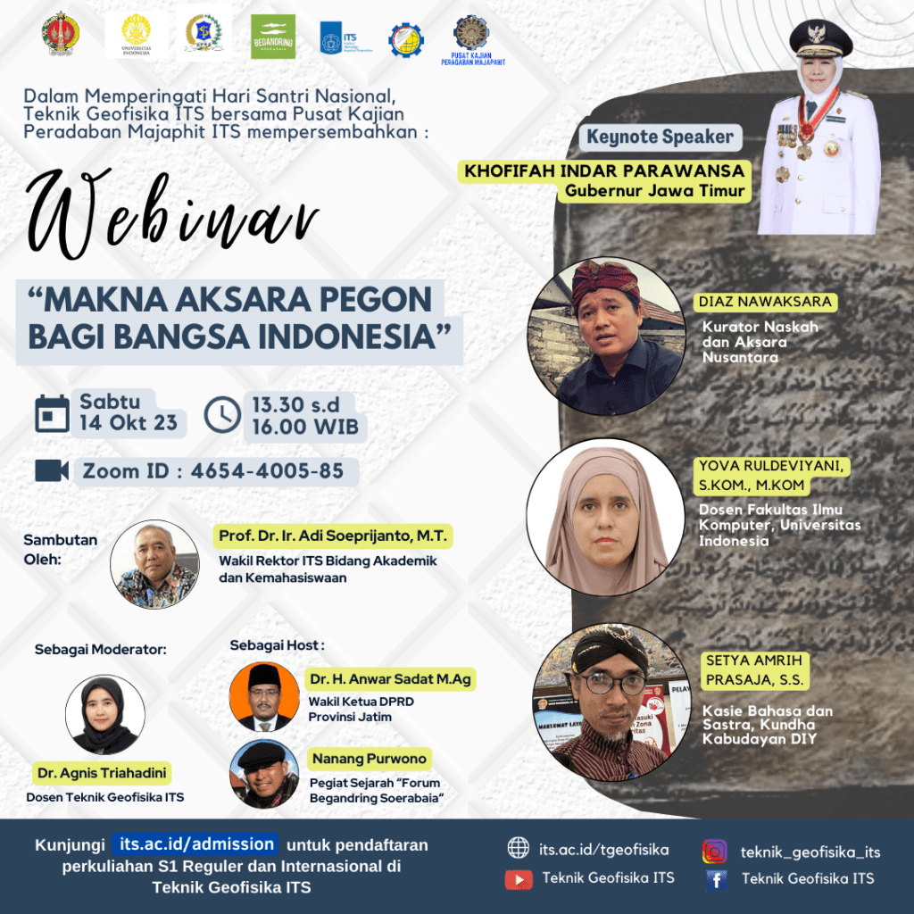 Kami ITS dan komunitas Begandring bekerja sama dengan Kundha Kebudayaan DIY, Universitas Indonesia dan Kurator mengadakan webinar dengan tujuan untuk mengenalkan aksara pegon dan makna bagi bangsa Indonesia dengan judul “WEBINAR MAKNA AKSARA PEGON BAGI BANGSA INDONESIA”, bersama :