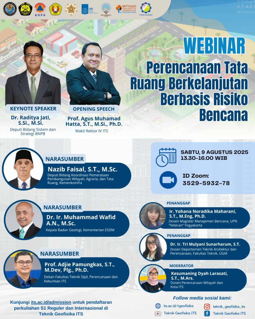 Sejalan dengan Misi ITS untuk memberikan kontribusi dalam ilmu pengetahuan dan teknologi untuk kesejahteraan masyarakat melalui kegiatan pendidikan, penelitian, pengabdian kepada masyarakat dan manajemen yang berbasis teknologi informasi dan komunikasi. Kami Departemen Teknik Geofisika FTSPK-ITS bersama Kemen ATR/BPN dan BNPB mengadakan webinar tentang Perencanaan Tata Ruang Berkelanjutan Berbasis Risiko Bencana bersama: