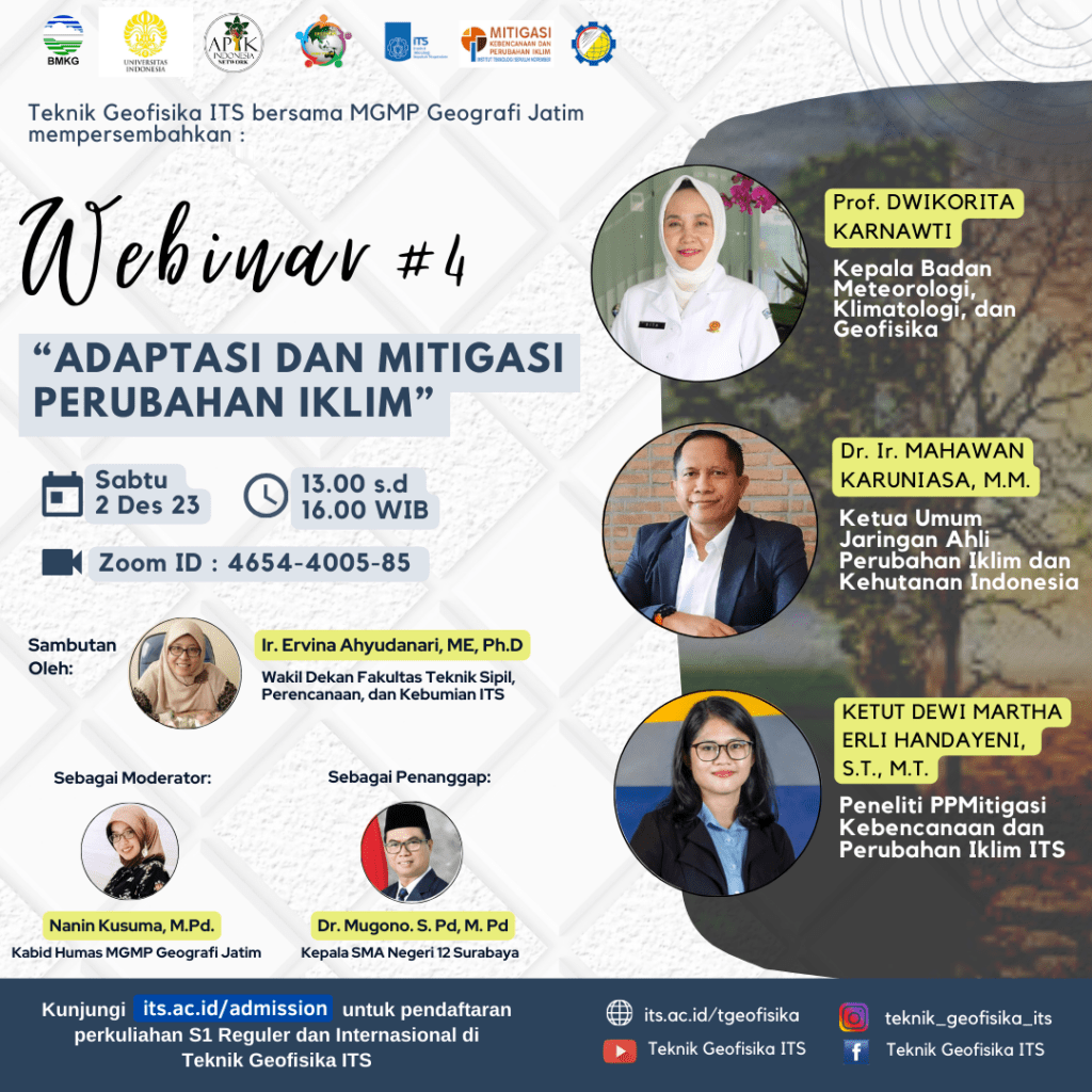 Teknik Geofisika ITS menyelenggarakan WEBINAR PERUBAHAN IKLIM DAN DAMPAKNYA, mengundang pembicara :