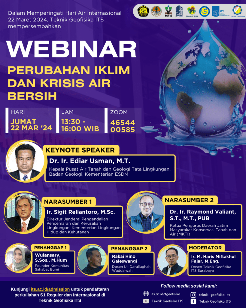 Kami Departemen Teknik Geofisika ITS, Kementerian KLHK, Badan Geologi -ESDM- MKTI-IAGI-Universitas Islam Internasional dan Komunitas Sahabat Bumi akan menyelenggarakan Webinar PERUBAHAN IKLIM DAN KRISIS AIR BERSIH dengan tujuan untuk mengetahui seberapa besar pengaruh perubahan iklim dan perubahan penggunaan lahan mempengaruhi krisis air bersih. Harapannya kita semua bisa ikut berpartisipasi mengurangi dampak tersebut: