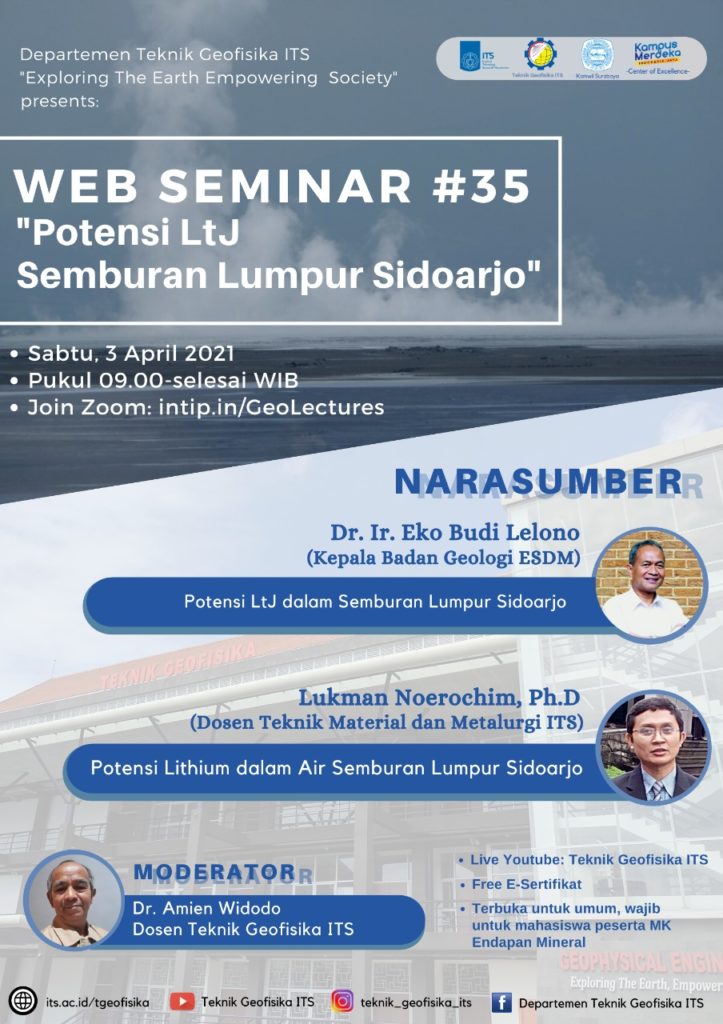 The Department of Geophysics Engineering ITS in collaboration with HAGI Komwil Surabaya will hold a Web Seminar on Potential LtJ in Sidoarjo Mud by inviting the Badan Geologi Kementerian ESDM and ITS researchers who have studied LtJ in the mud.