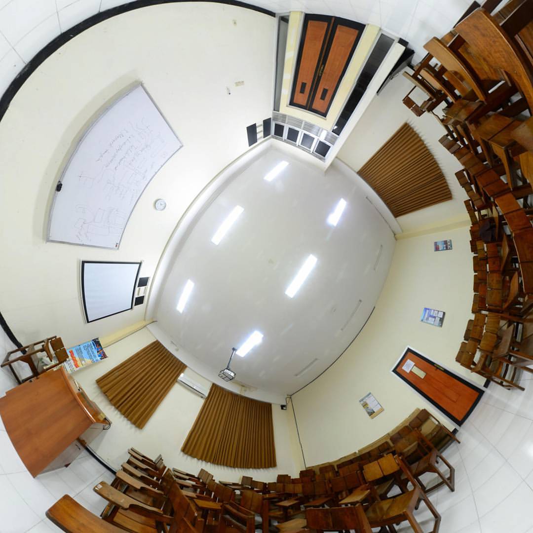 Foto ini adalah gambaran ruang kuliah GM 301. Difoto dengan teknik stereographic projection sehingga dalam satu foto dapat menghasilkan kenampakan seluruh interior ruangan.