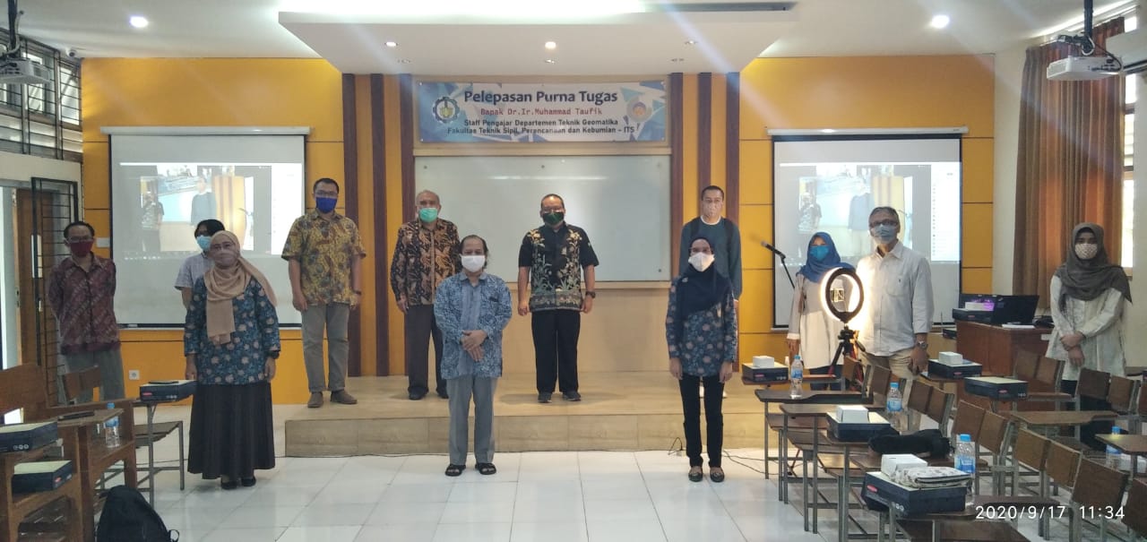 Kamis, 17 September 2020 Departemen Teknik Geomatika telah mengadakan acara pelepasan Purna Tugas bapak Dr.Ir. Muhammad Taufik yang merupakan salah seorang Founding Father / bapak pendiri Departemen Teknik Geomatika. Di awal acara Kepala Departemen, bapak Danar Guruh Pratomo, ST, MT, Ph.D. memberikan sambutan ucapan selamat memasuki masa purna tugas /pensiun kepada Dr.Ir. Muhammad Taufik, semoga masa pensiun ini dapat dinikmati dengan penuh rasa kebahagian dan suka cita bersama keluarga.